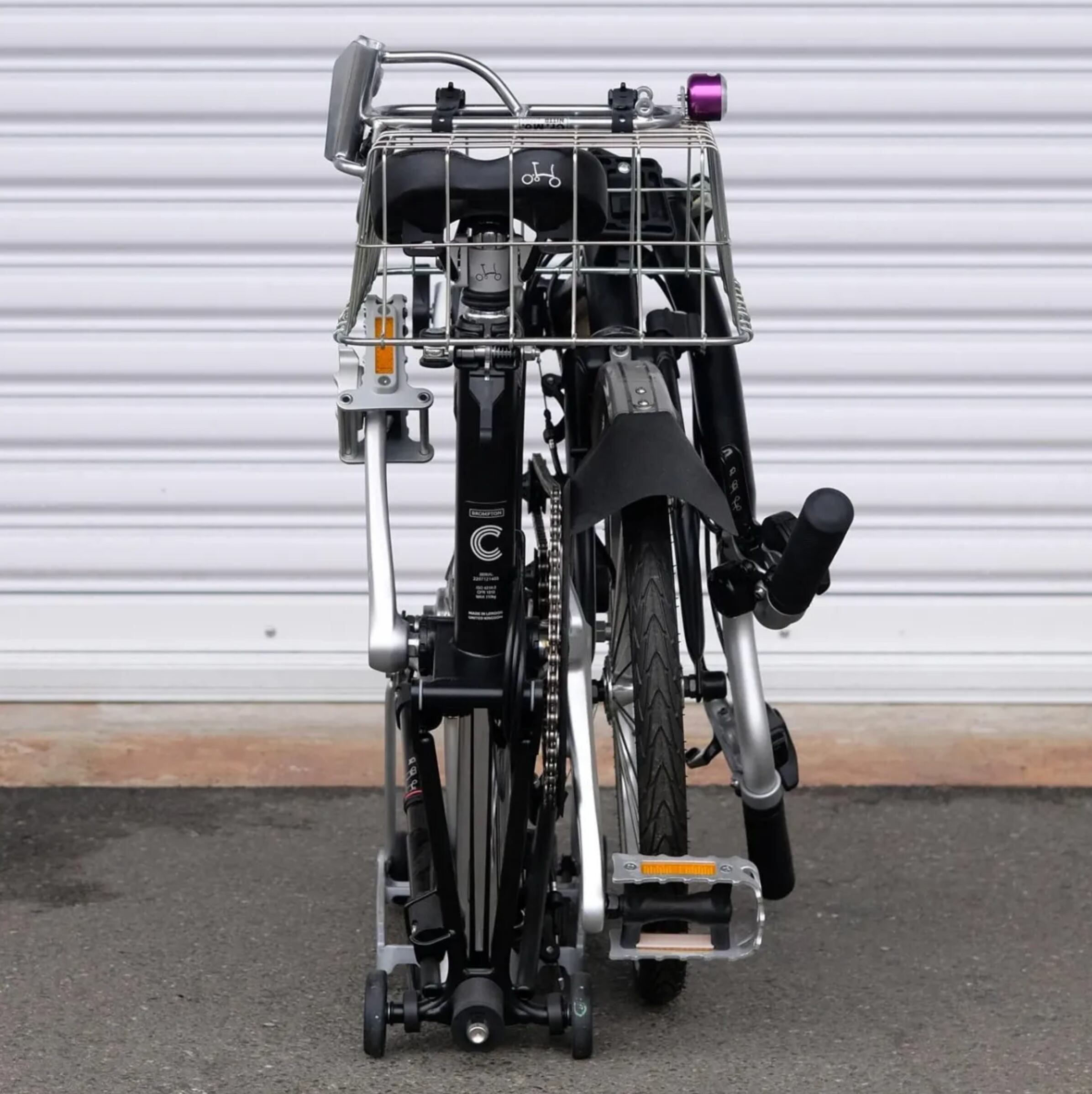 ワンタッチで脱着できるので、輪行や折りたたみ時にも邪魔にならず、ブロンプトン本来のコンパクトさをそのままキープ。スマートさを損なわずに積載力をプラスできるのは、このキャリアならではの強みです。