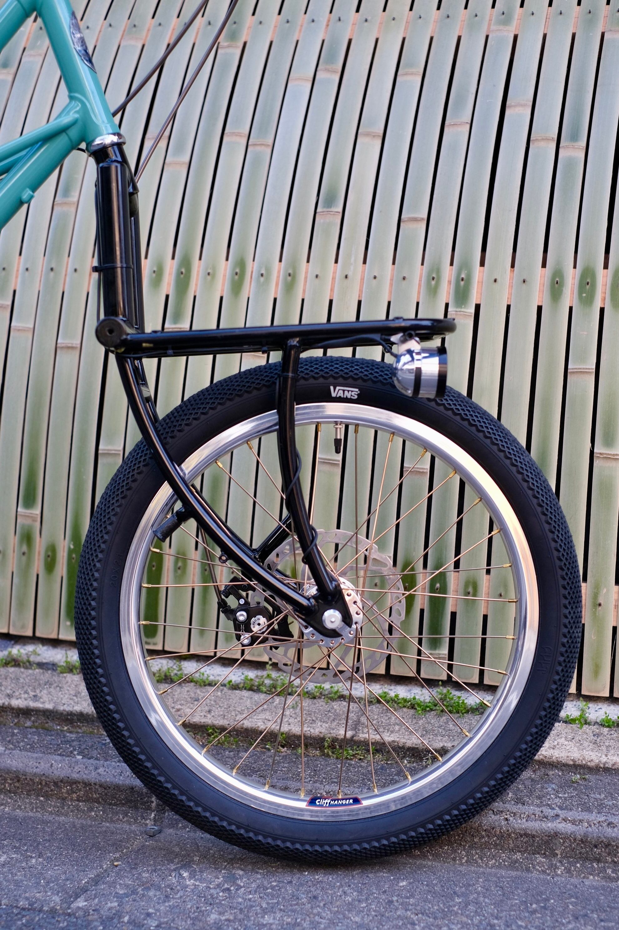 20インチホイールを採用し、重い荷物も低い位置で安定して運べるカーゴフォークです。ディスク/Vブレーキに対応し、アイレットも多数装備。カゴや箱を直接固定でき、ダイナモライトで日常仕様にカスタムするのもおすすめ。