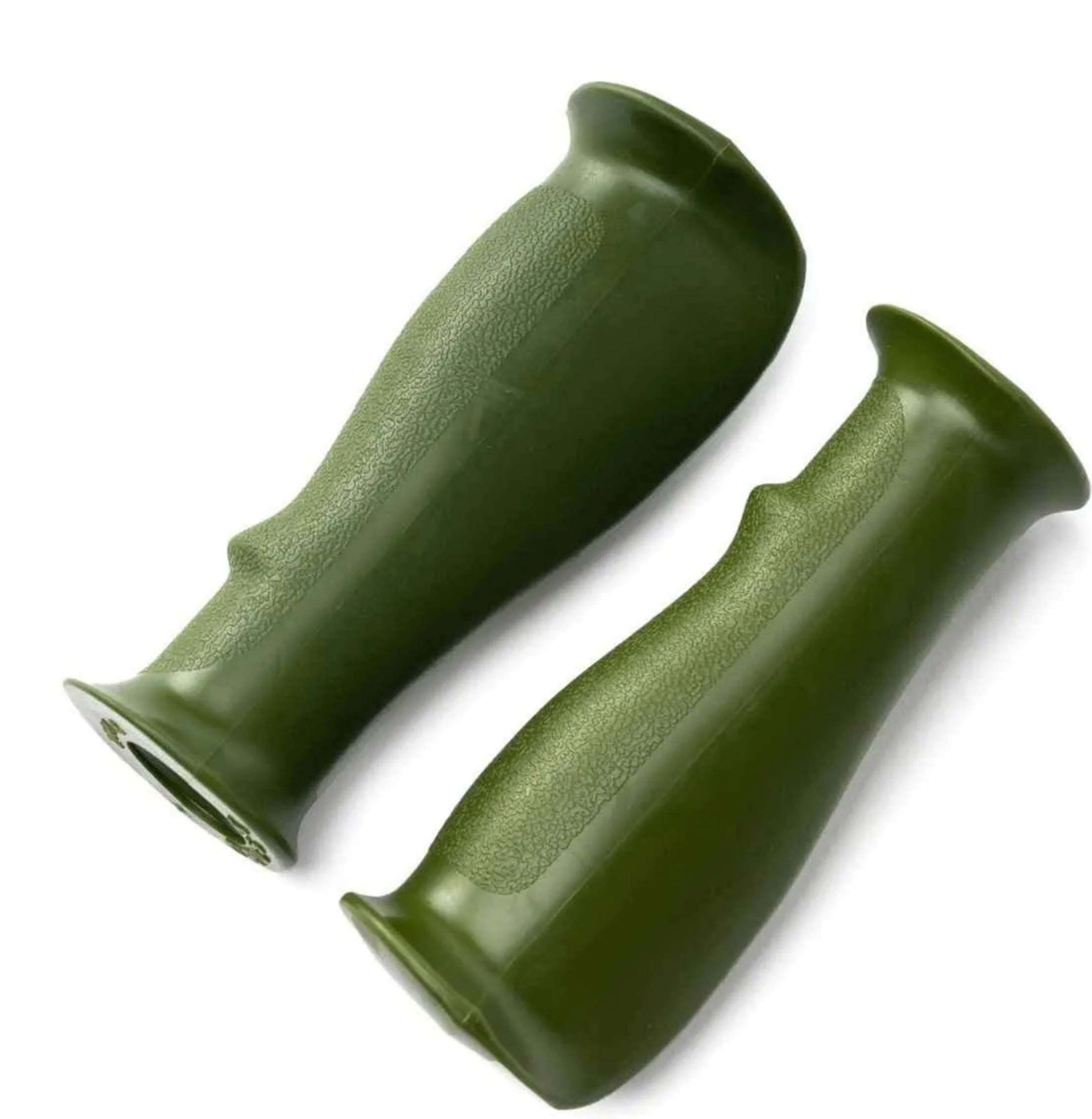 ややエルゴ形状で握りやすく、乗り心地も快適。モトバイク風のフランジがアクセントになり、ただのグリップ以上の存在感を放ちます。