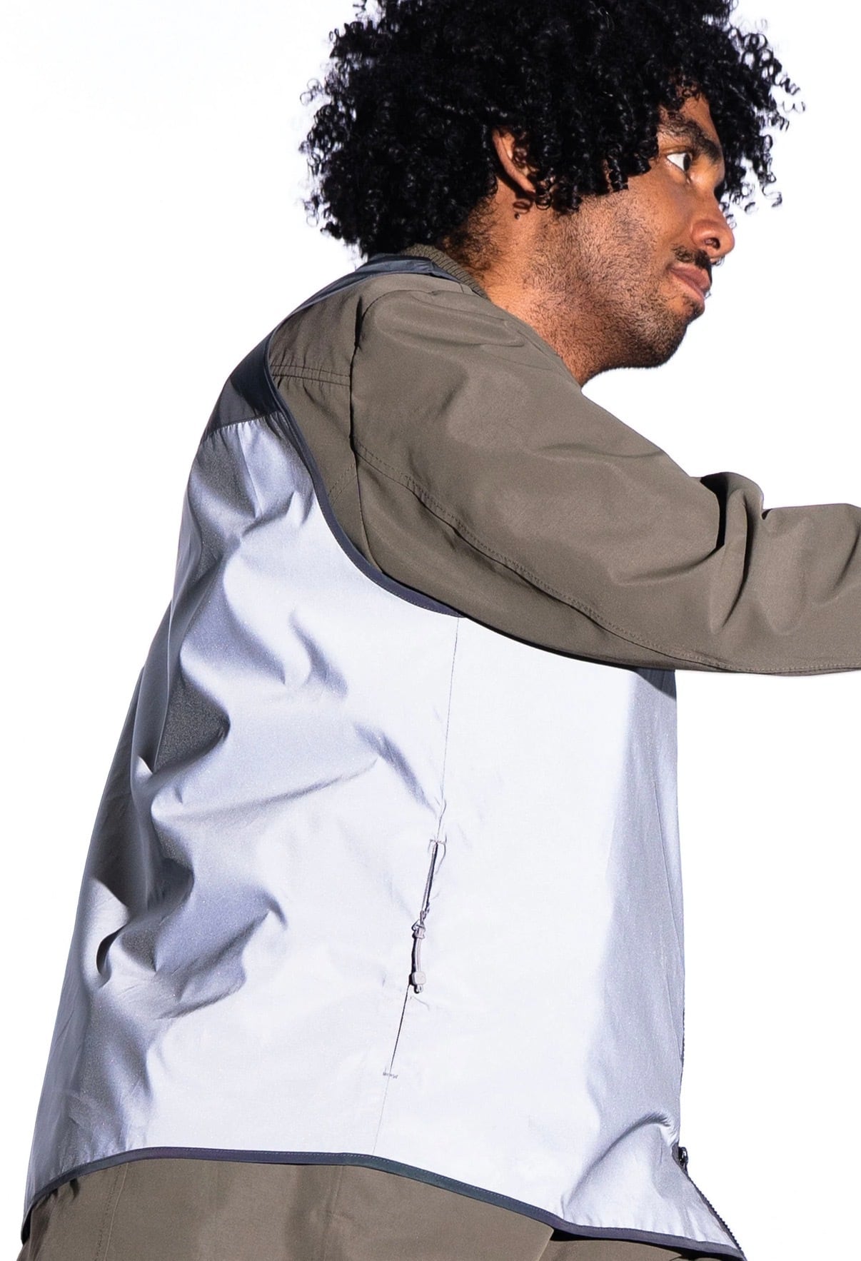 最大150mから視認できる反射性能。軽量ポリエステル素材。ツーウェイジップ仕様。背面ロングテールデザイン。左右にシームポケット付き。カラーは虹色の微光沢をもつエレガントグレー。