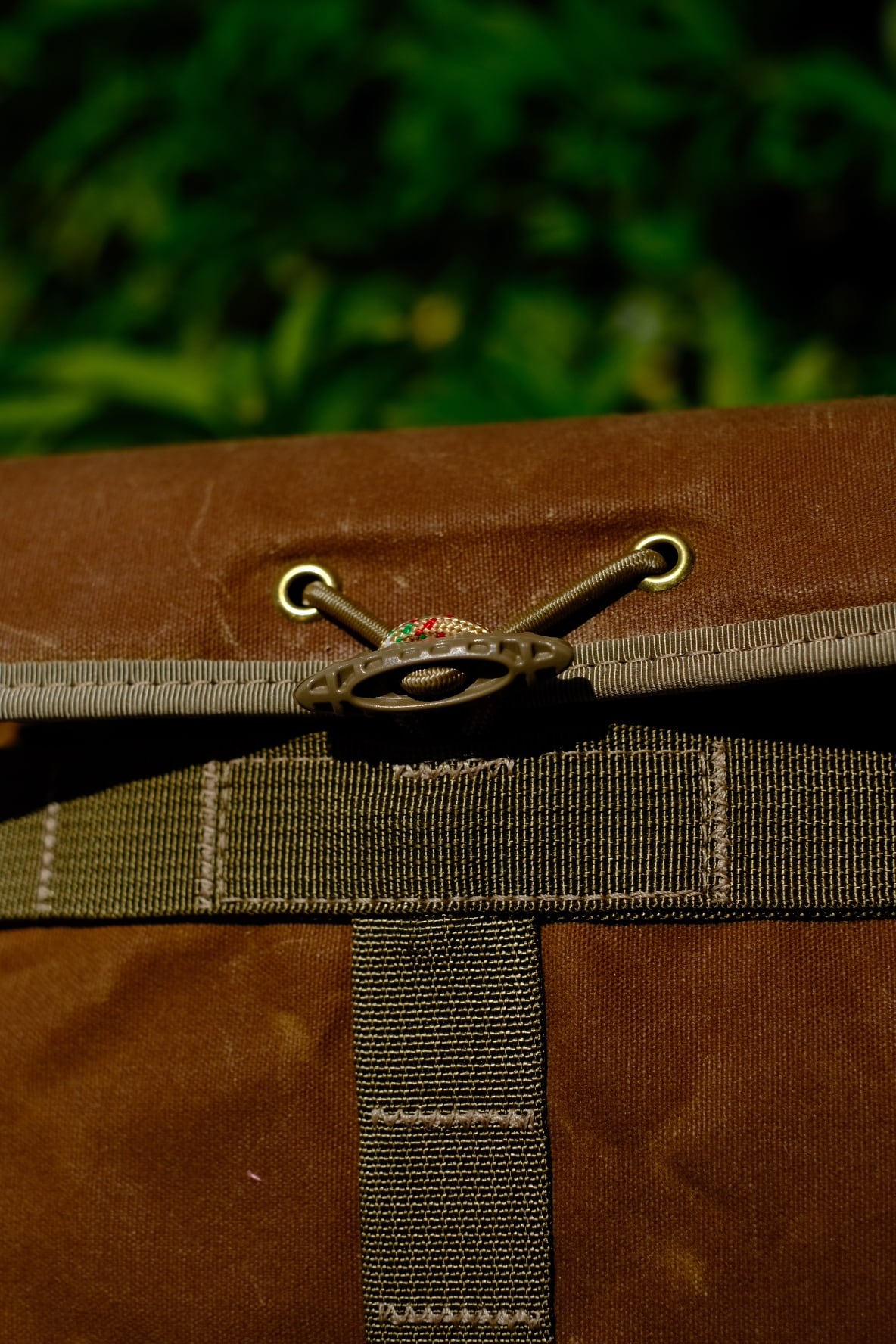 メインの開口部はドローコード式で、ステムに引っ掛けたり背面のループに固定したりと使い方を選べます。両サイドにも調整可能なドローコード付きポケットを装備。スマホや小型カメラの収納にも便利です。