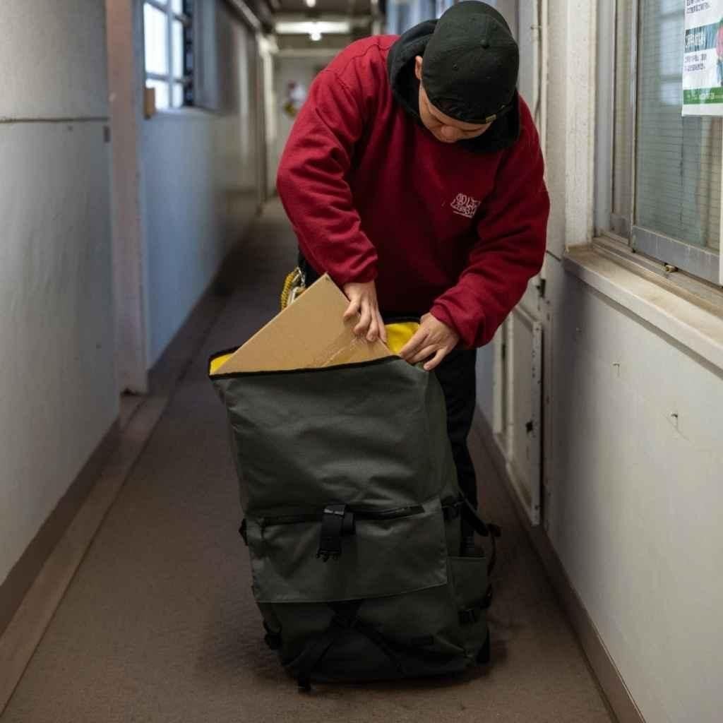 メッセンジャーバッグ由来の無骨なつくりと、とにかく入る容量が魅力のモデルです。