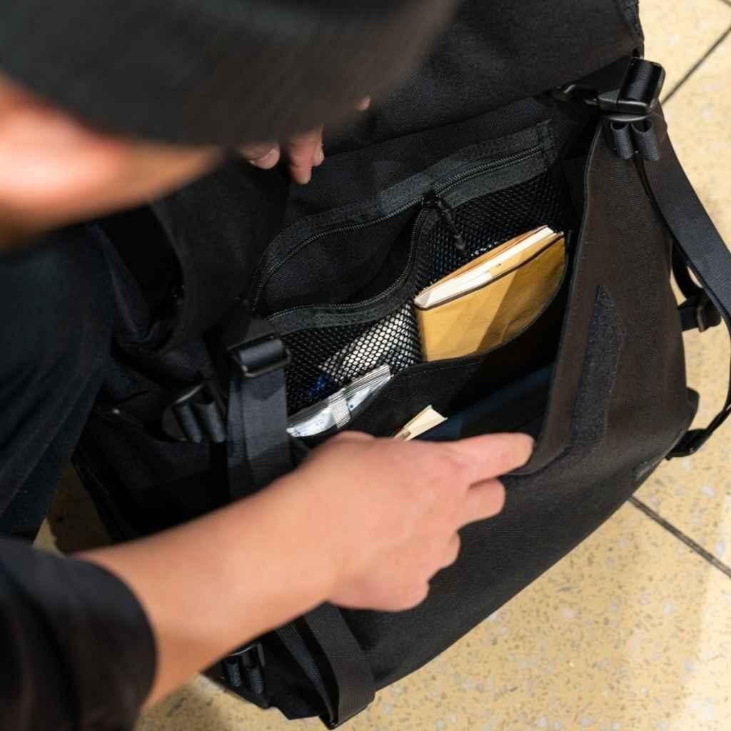 サイドポケット、フロントポケット、内部のメッシュポケットなど、実際に使うと「ここでいいよね」と思える配置です。