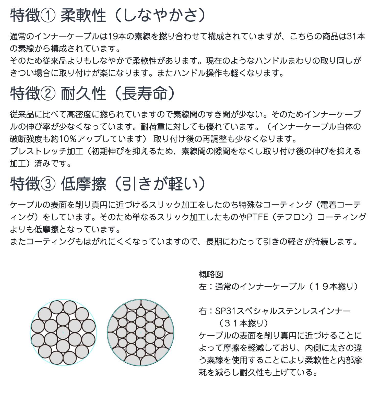 SP31スペシャルステンレスインナーケーブルは、高品質なバイク用インナーケーブルです。従来の19本素線ではなく、31本素線で作られており、柔軟性が高く、ハンドル操作が軽やかです。高密度の撚りにより、耐久性が向上し、伸びにくくなっています。さらに、スリック加工と特殊コーティングにより、低摩擦で引きが軽いです。台湾で生産され、特許を含む独自仕様で、品質は従来のJIS規格よりも厳しい基準でチェックされています。