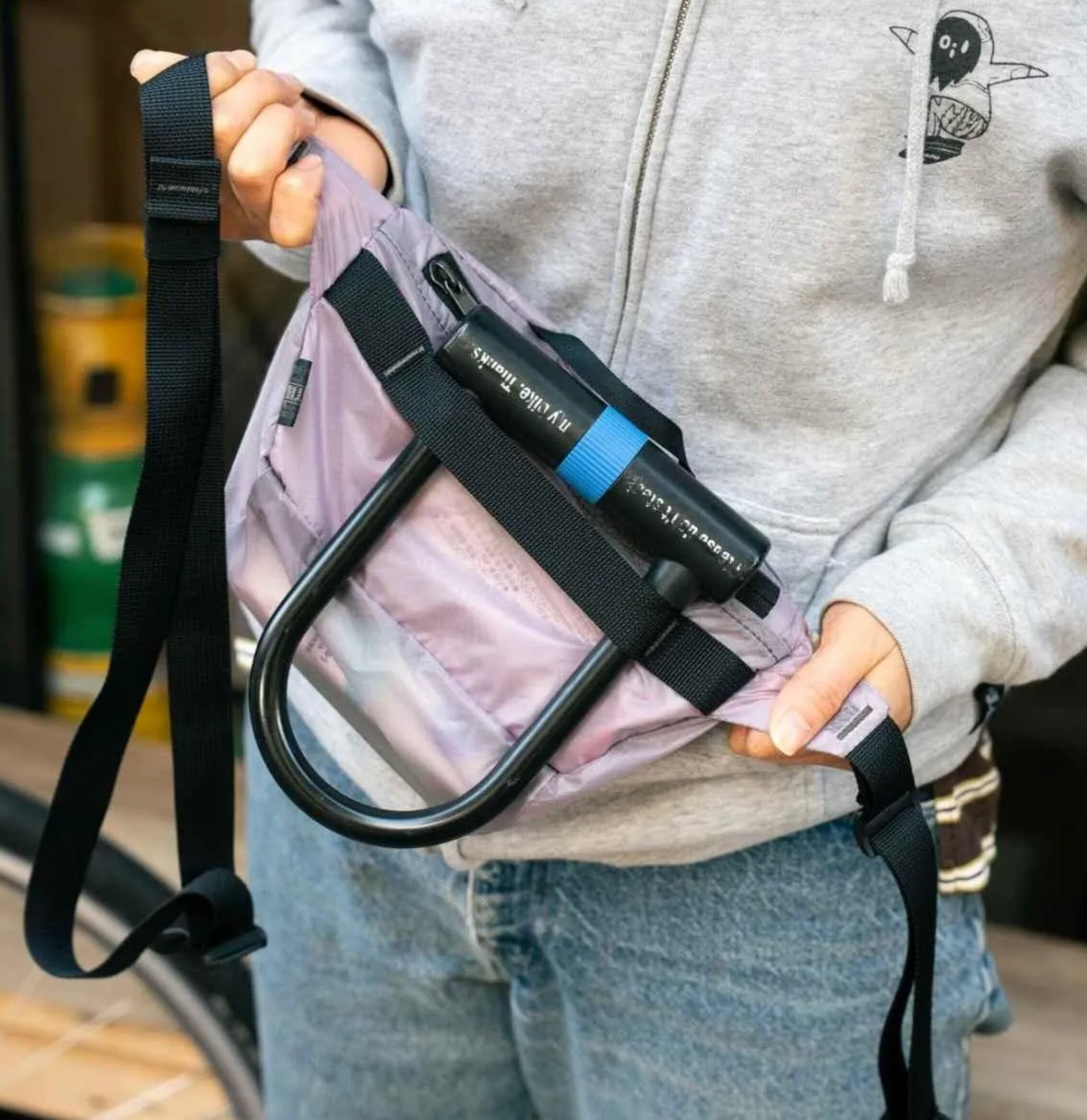背面には自転車乗りに嬉しいUロックホルダー付き。ストラップも肩掛けしやすい長さに設定されています。
