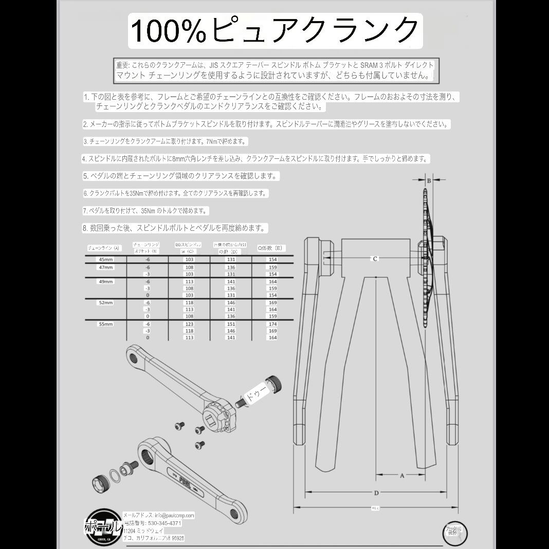 チェーンラインやチェーンリングのオフセット、BB軸長の選定にあたっては、付属の説明書、またはメーカーサイトのテクニカルページ(https://www.paulcomp.com/wp-content/uploads/2025/03/JIS_crankarms2025.pdf)をご確認ください。