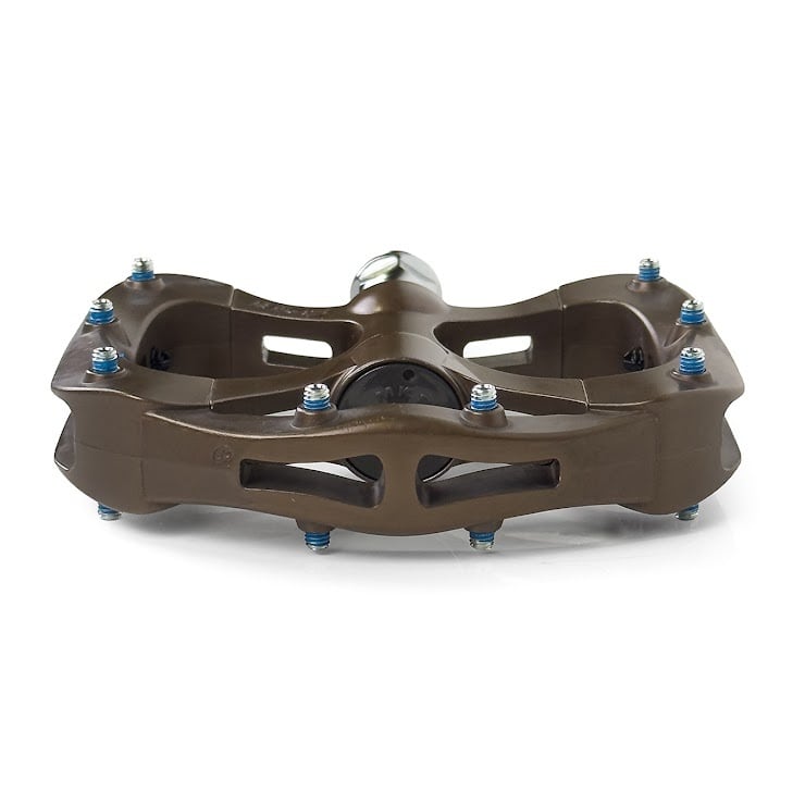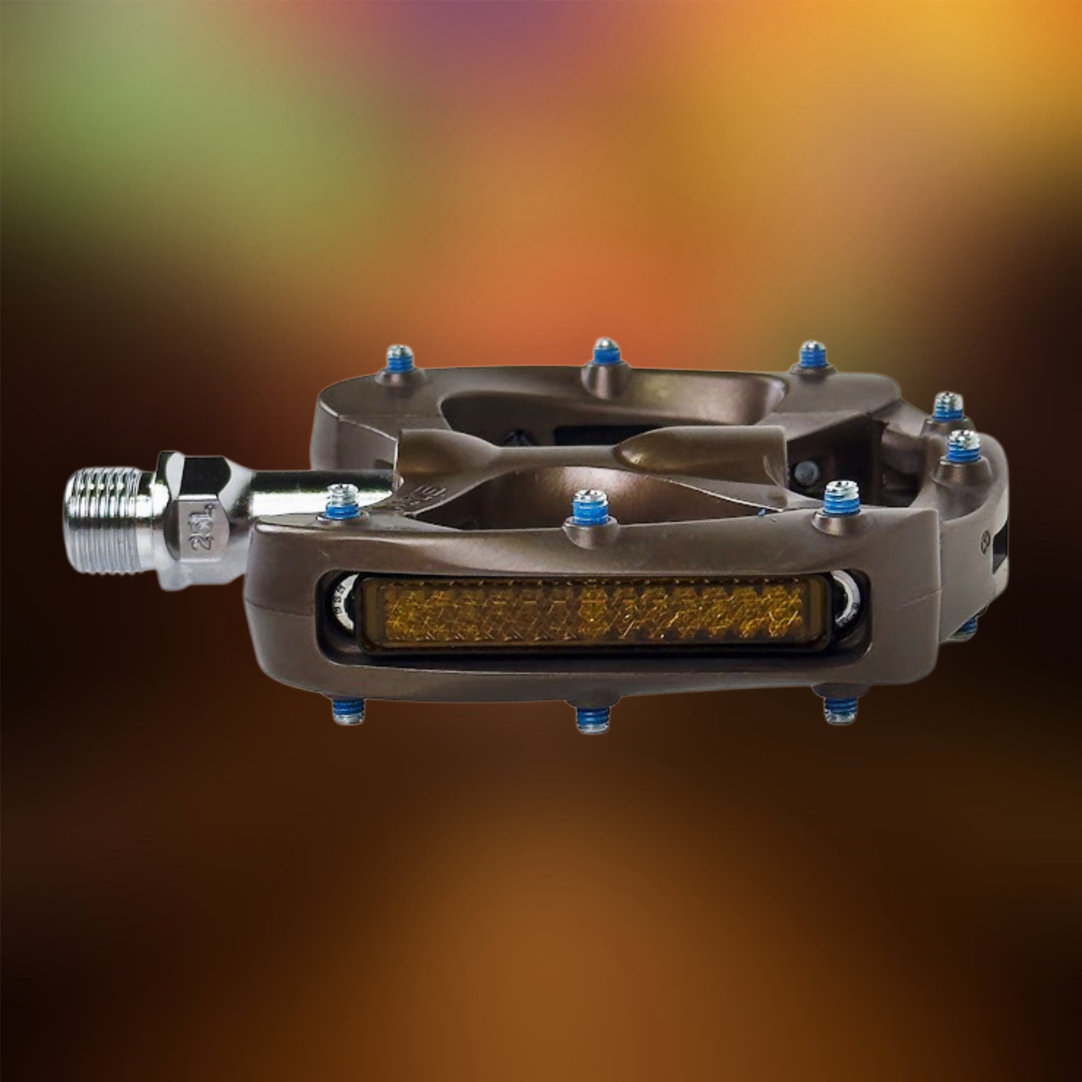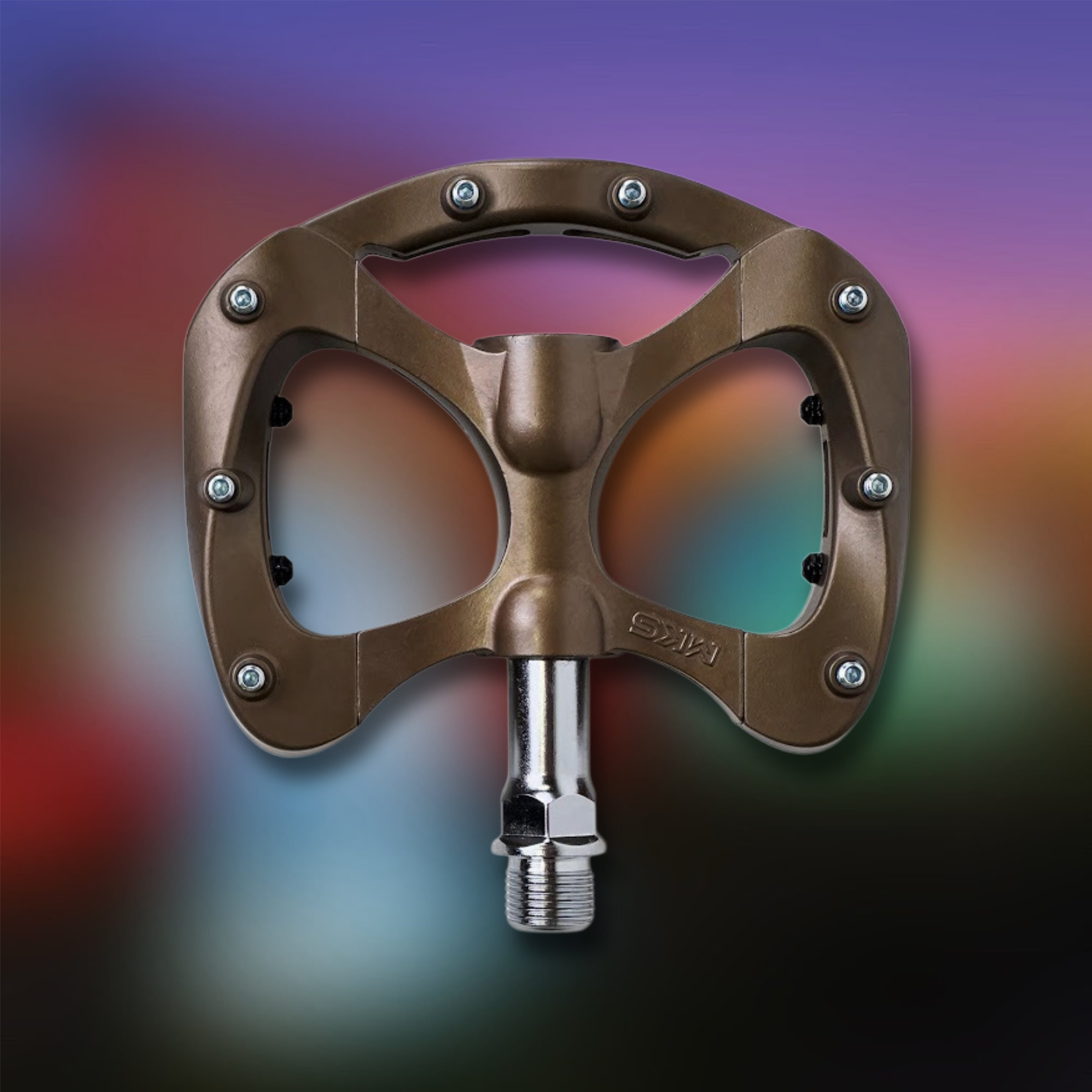 ベースは縦長シルエットが特徴のGamma。サイドを覆うC型ダイカストパーツにより踏み面を広く確保し、8本のスパイクピンと緩やかなコンケーブ形状でしっかりとしたグリップを実現。街乗りからグラベルまで安心して使える設計です。