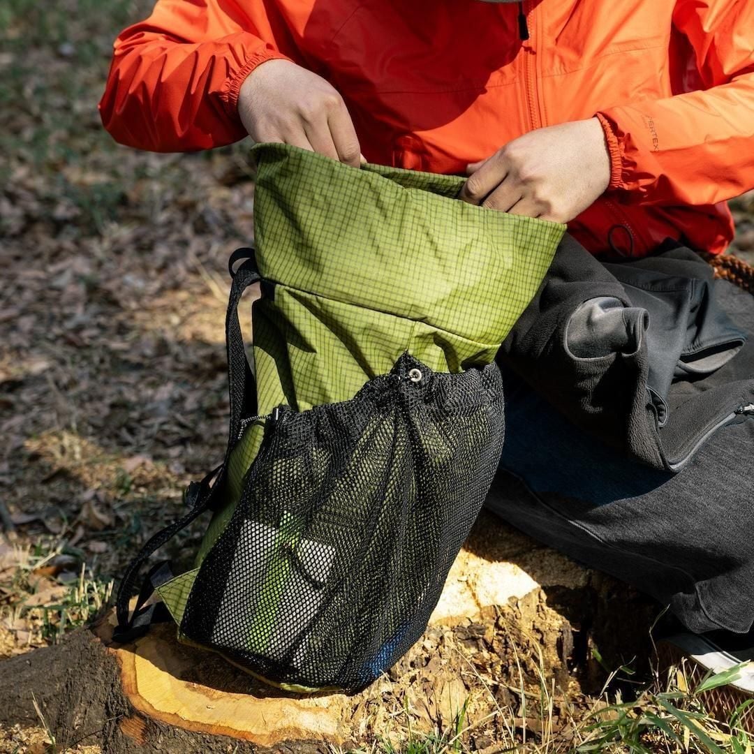 このバックパックは、簡単に折りたたんで内側のポケットに収納でき、必要な時にはコンパクトに持ち運べる設計。キャンプライドや旅行中のサブバッグとして最適で、使い勝手の良さが魅力です。