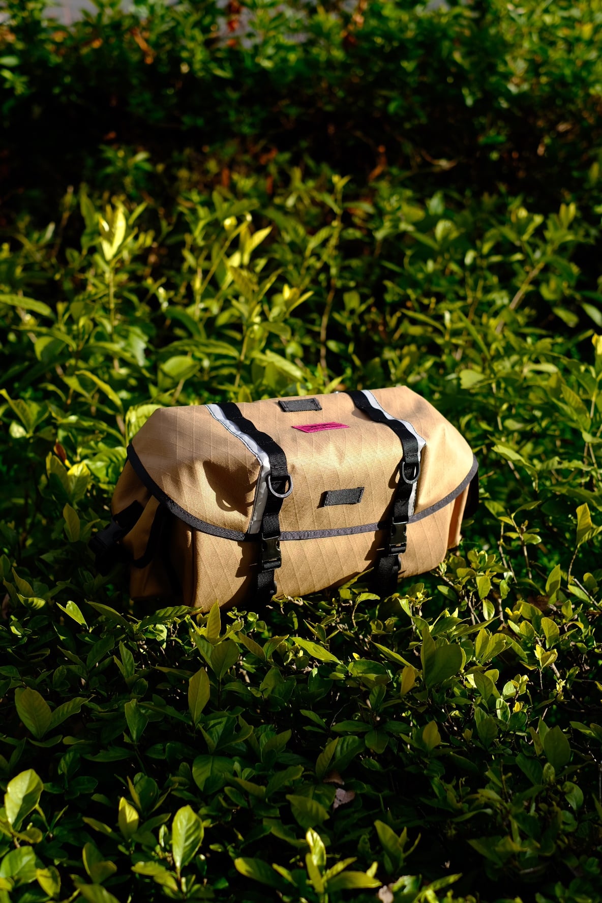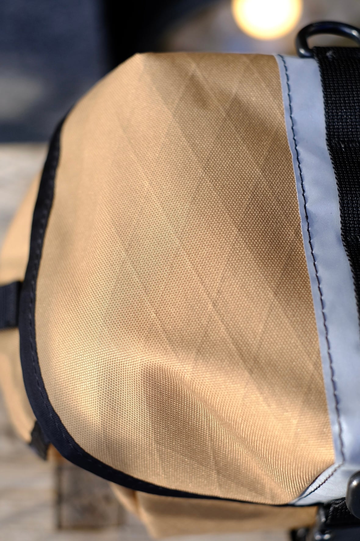 600デニールのリサイクルポリエステルをベースに、防水フィルムと補強ファイバーをラミネートした構造で、