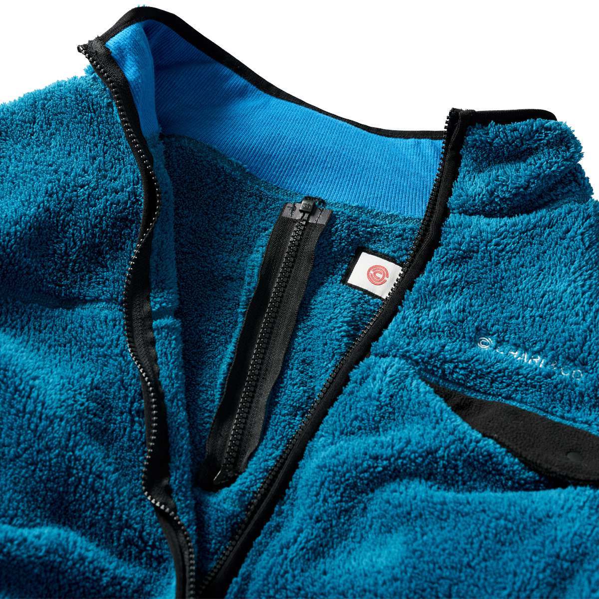 温かみのあるシンプルなフリースジャケット。首後ろに設置されたファスナーを引くとベンチレーションになる。