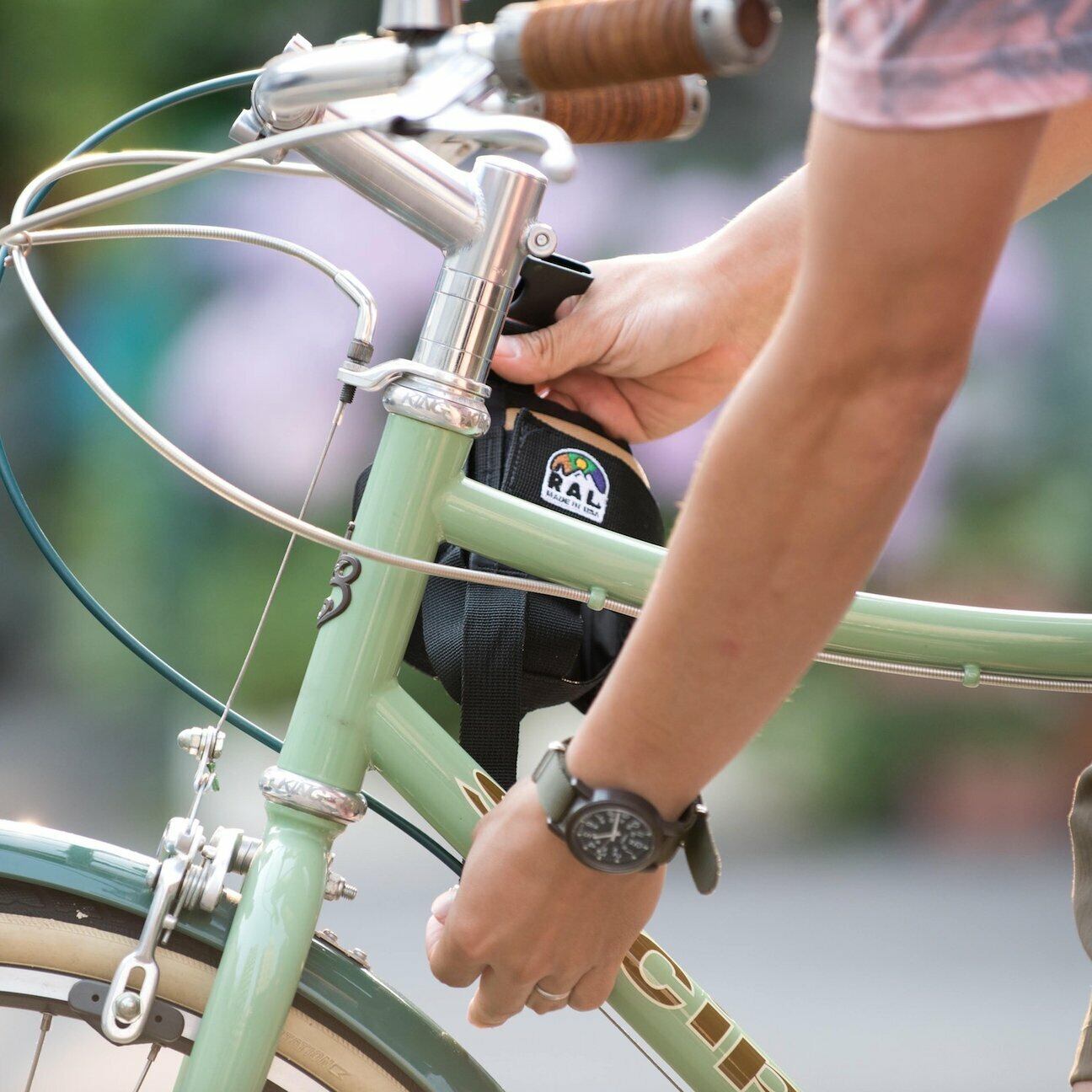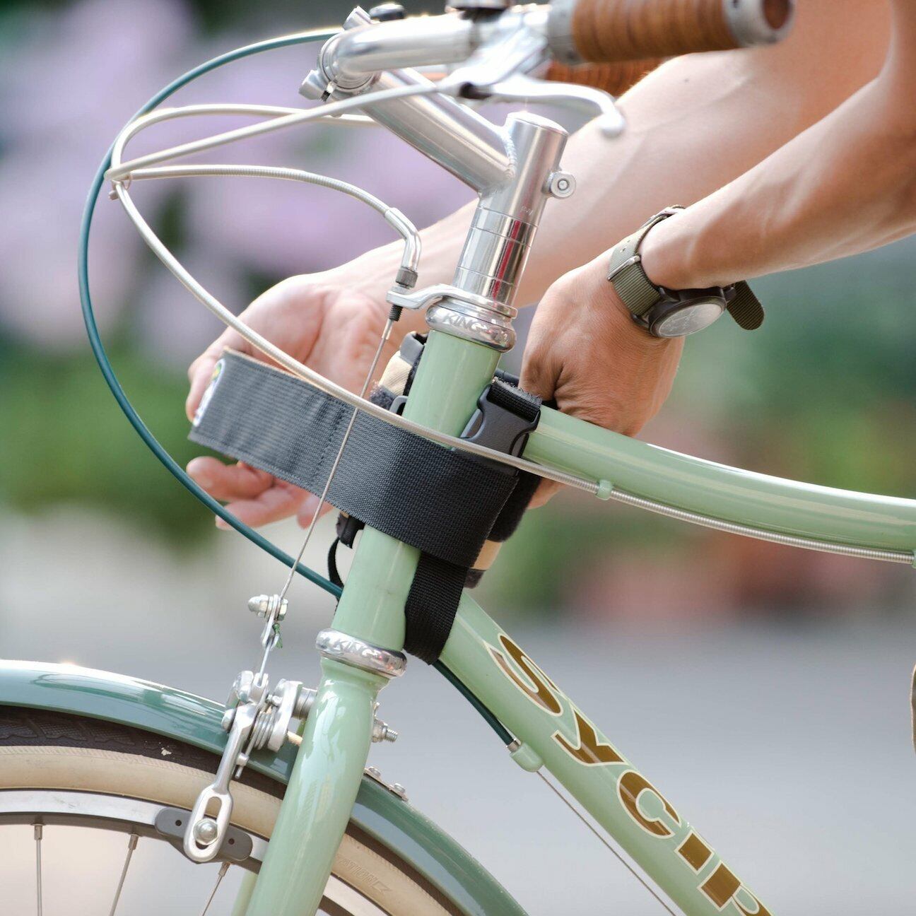 取り付け方法はとても簡単です。まずは先端にバックルの付いた細めのストラップでトップチューブとダウンチューブに固定します。その後、RALのロゴの入った太めのストラップをヘッドチューブの全面から固定した細いストラップを裏を通し、元に戻してマジックテープで固定します。これだけで固定は完了です。