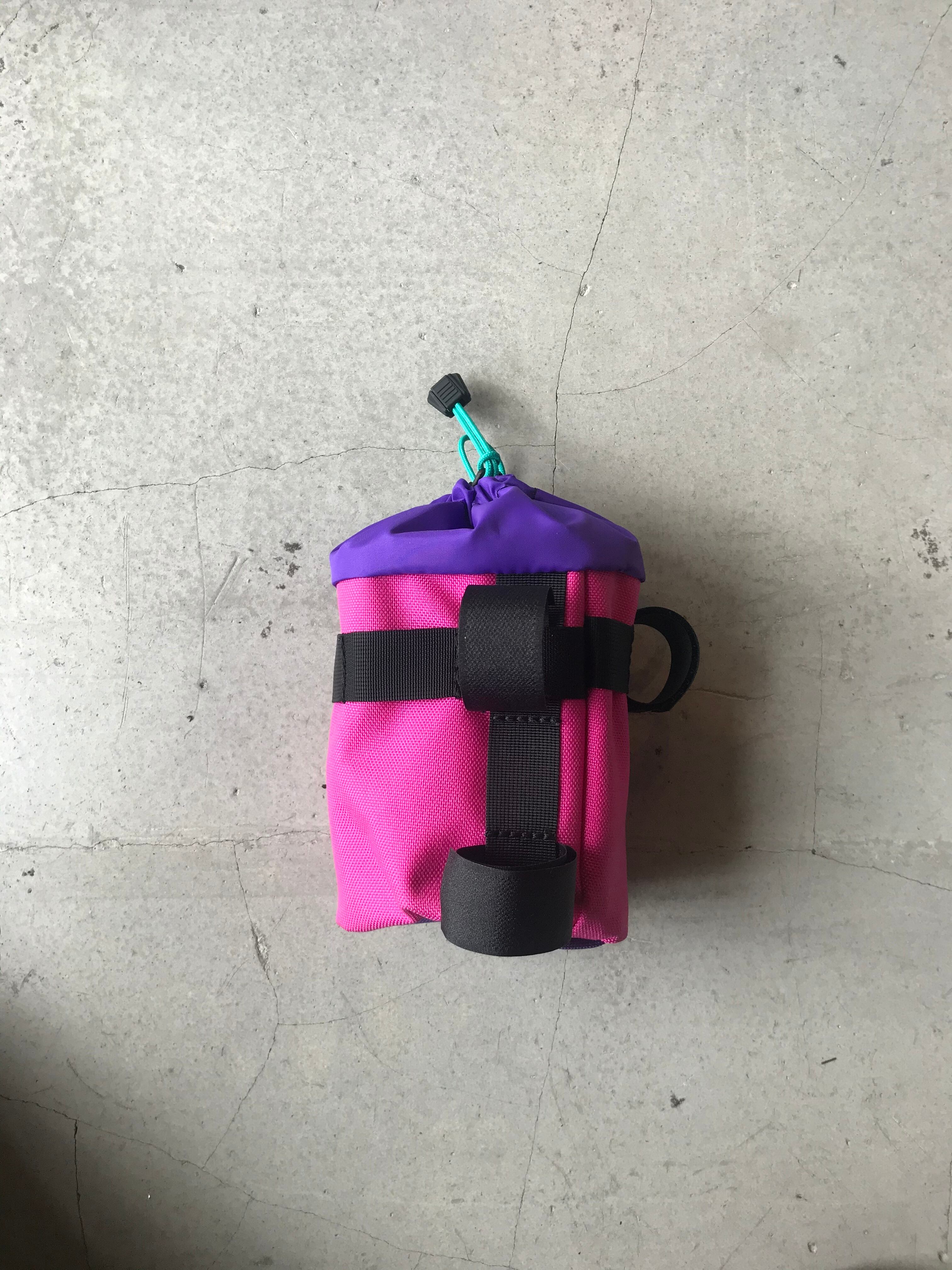 携帯、ボトルや携行食、モバイルバッテリー、コンデジ等身の回り品を入れるのに便利で、巾着の開閉はグローブを付けてても開け閉めしやすい特殊なパーツで開閉します。