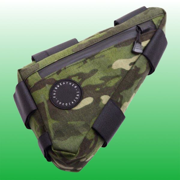 FAIRWEATHERの商品は雨天のライドでも活躍できように水や泥などにも強く作っており、フレームのさまざまなところに装着できるように作られたミニバッグです。