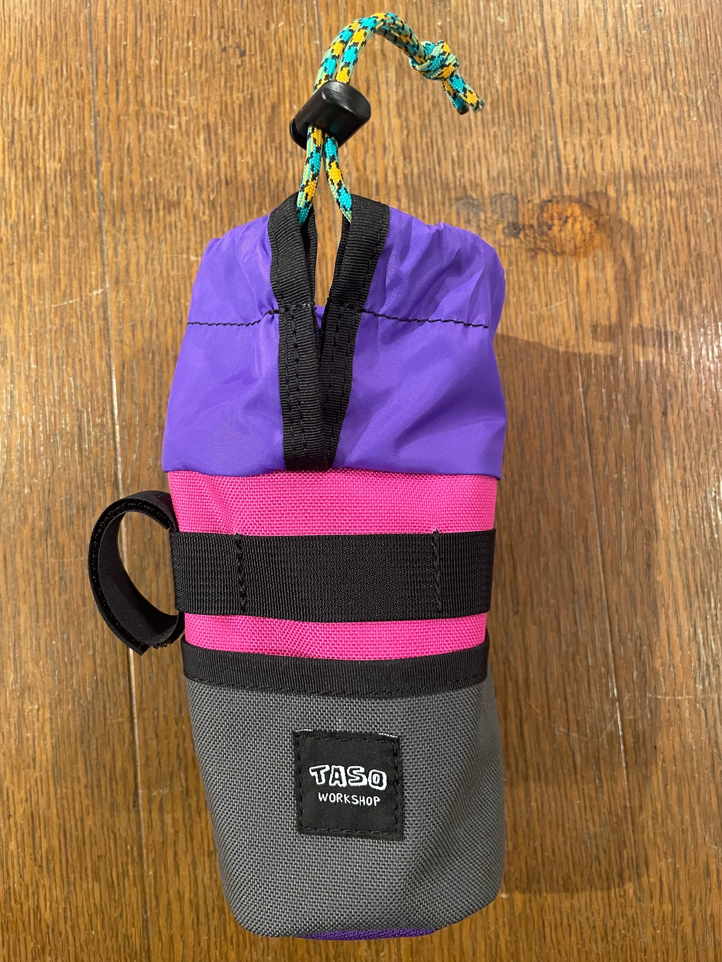 携帯、ボトルや携行食、モバイルバッテリー、コンデジ等身の回り品を入れるのに便利で、巾着の開閉はグローブを付けてても開け閉めしやすい特殊なパーツで開閉します。