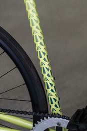 目立つ逆三角形のパシュートフレームとエアロ形状のクロモリパイプが特徴的な攻撃的デザイン。