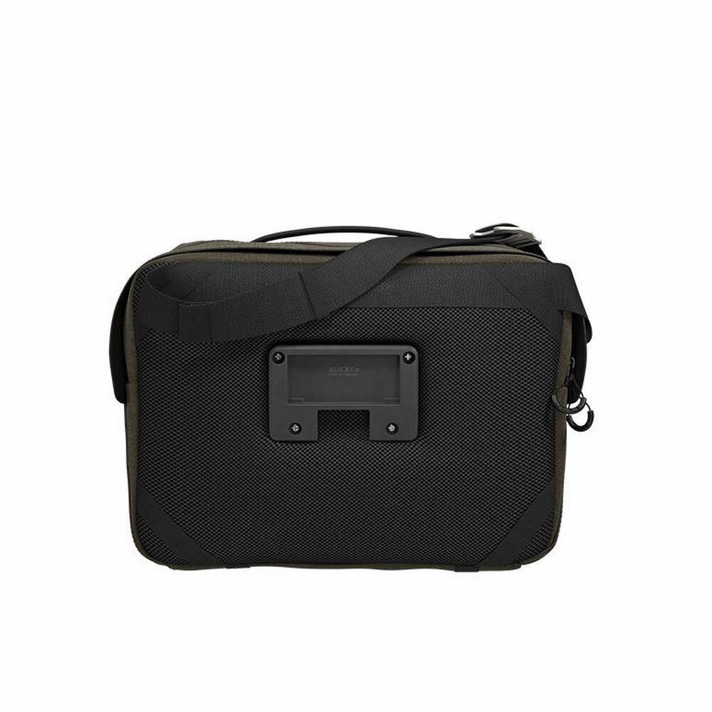 底面のストラップとアルミニウム製バックルでバッグの厚みも調整可能。ショルダーストラップも付属しているので、バイクから降りたあともショルダーバッグとして簡単に持ち運べます。