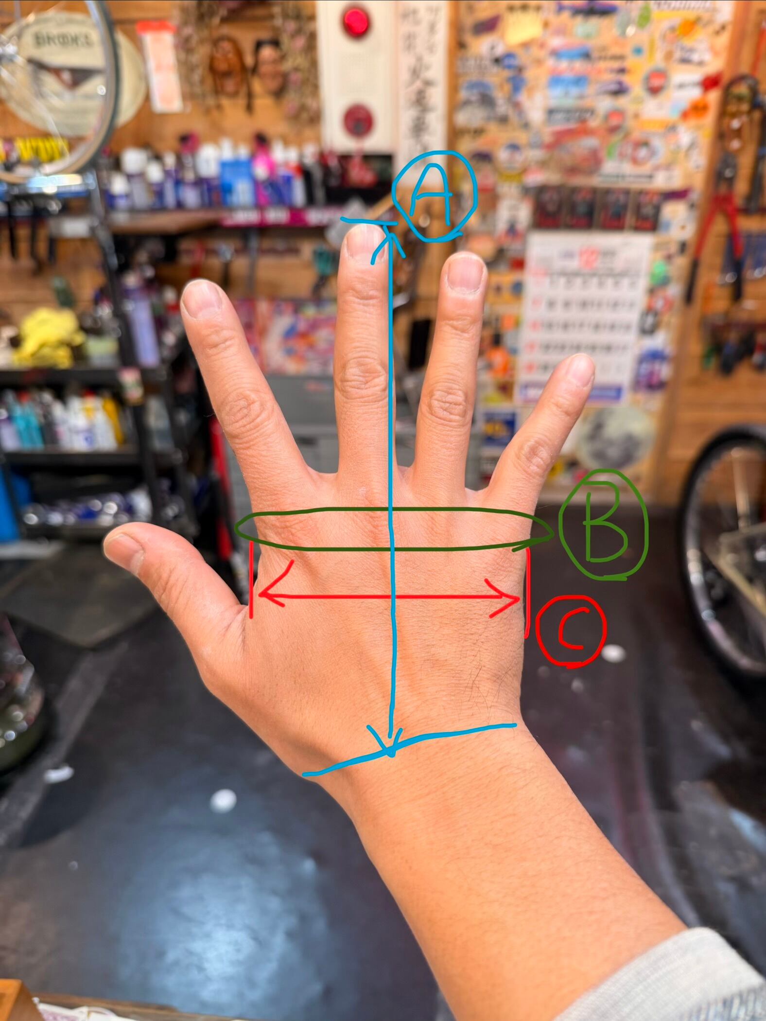 • A:手の長さ(中指の先端〜手首)19cm