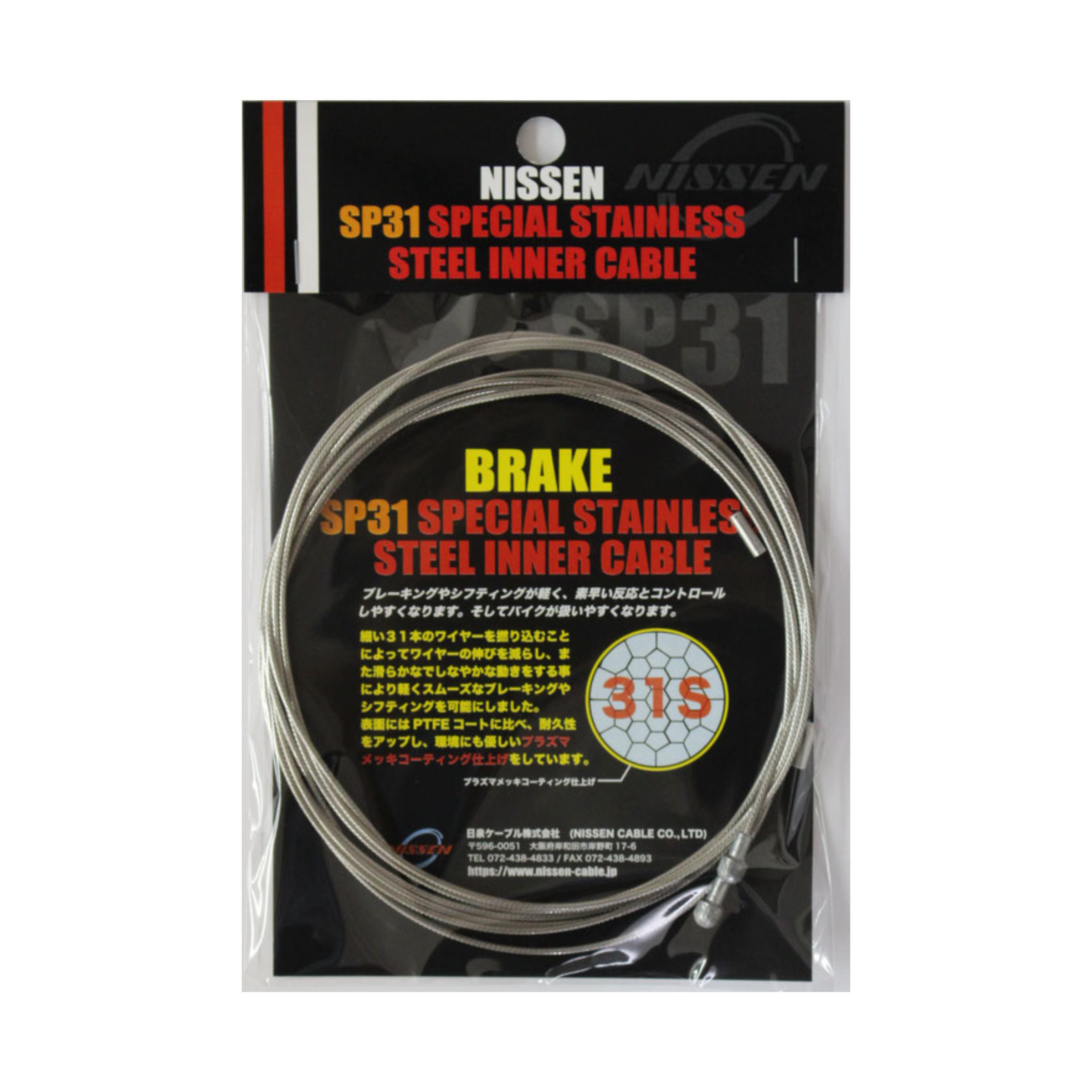 SP31スペシャルステンレスインナーケーブルは、高品質なバイク用インナーケーブルです。従来の19本素線ではなく、31本素線で作られており、柔軟性が高く、ハンドル操作が軽やかです。高密度の撚りにより、耐久性が向上し、伸びにくくなっています。さらに、スリック加工と特殊コーティングにより、低摩擦で引きが軽いです。台湾で生産され、特許を含む独自仕様で、品質は従来のJIS規格よりも厳しい基準でチェックされています。