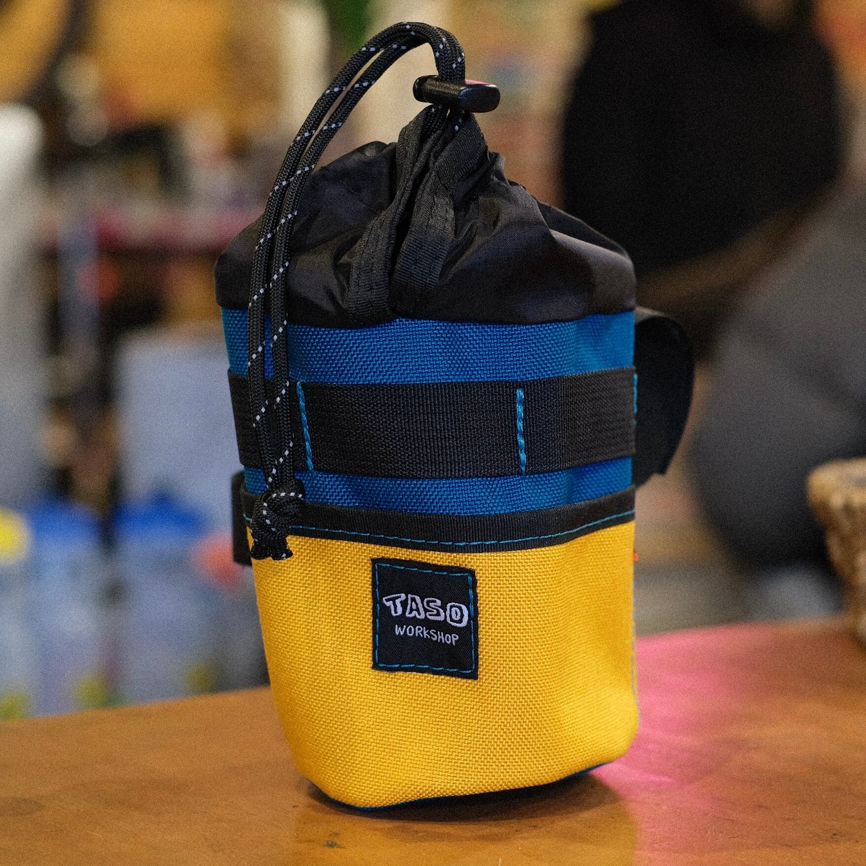 携帯、ボトルや携行食、モバイルバッテリー、コンデジ等身の回り品を入れるのに便利で、巾着の開閉はグローブを付けてても開け閉めしやすい特殊なパーツで開閉します。