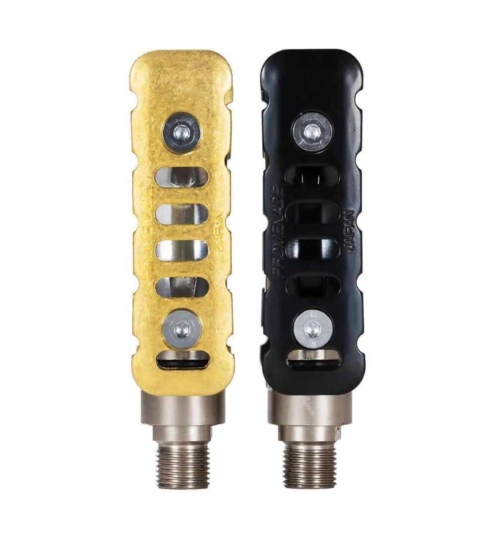 待望のサークルズ別注 MKS製真鍮&黒塗装ペダルは、MKSの技術と3年にわたる構想が結実した特別なモデルです。真鍮製の側板とブラックペイントの仕上げは、使用するごとにペイントが剥がれて真鍮の地金が顔を出し、独特の経年変化を楽しむことができます。露出した真鍮は酸化によってくすみ、緑青が浮かぶこともあり、使い込むことで個々のライダーだけの風合いが育まれます。